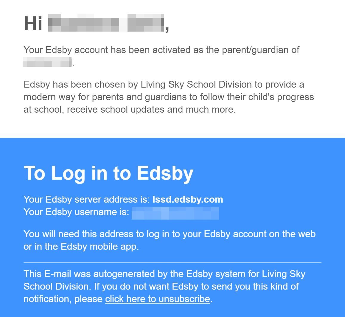 Once the account has been created, you will receive a 'Welcome to Edsby' email which contains the website address and your username that you will use to sign into Edsby